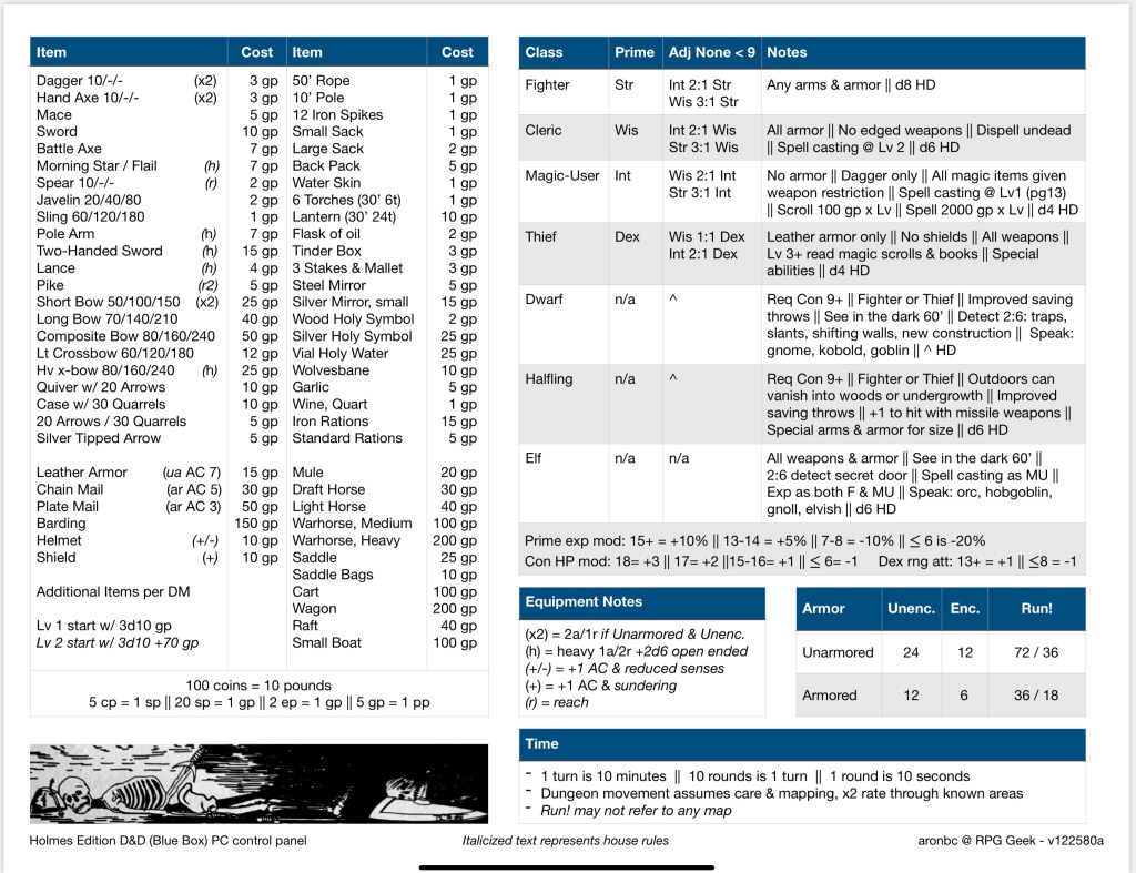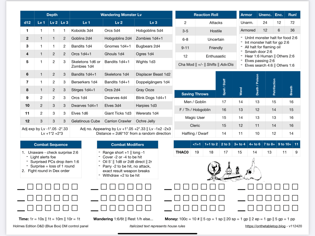 - DM Control Panel – provides turn track, core wandering monsters, reaction table, basic deeds, combat summary, and more all on a single page.