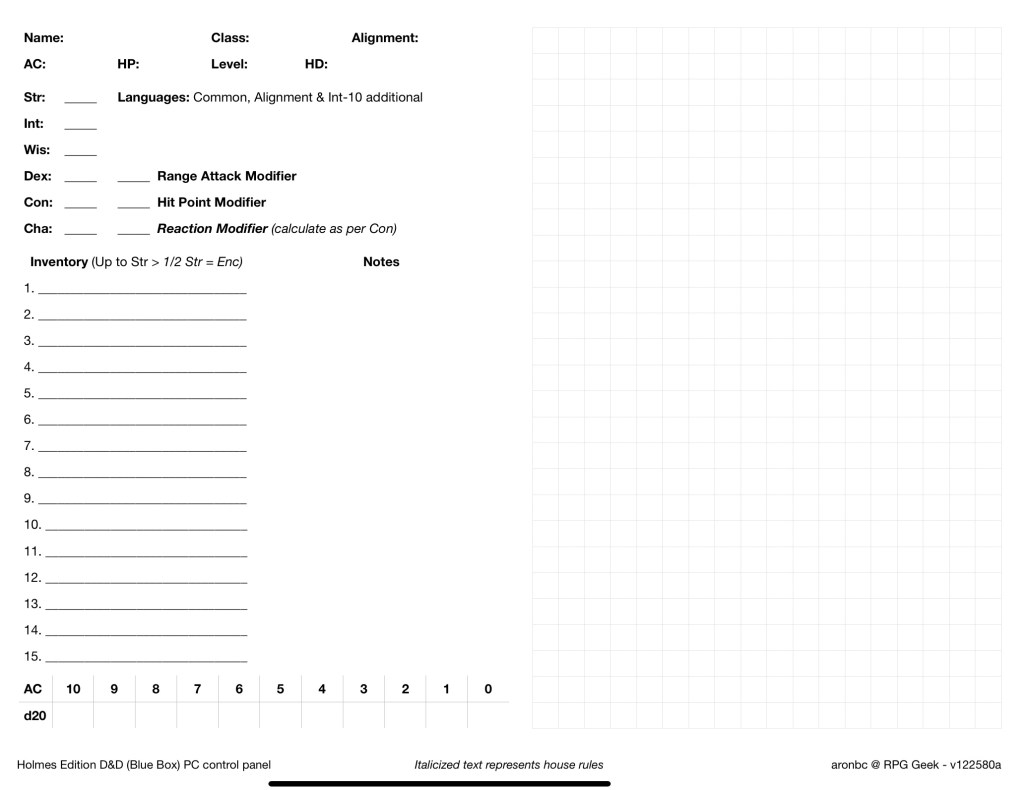 Our regular Thursday night group that plays online has been having good fun playing Holmes Basic D&D. We are delving into Gabor Lux’s Castle Morthimion – which I will also run at DunDraCon44 in just 2 weeks. I had always planned to put a little something on the 2nd side of these control panels & inspiration recently struck for the PC version – a simple character sheet, update is linked above.