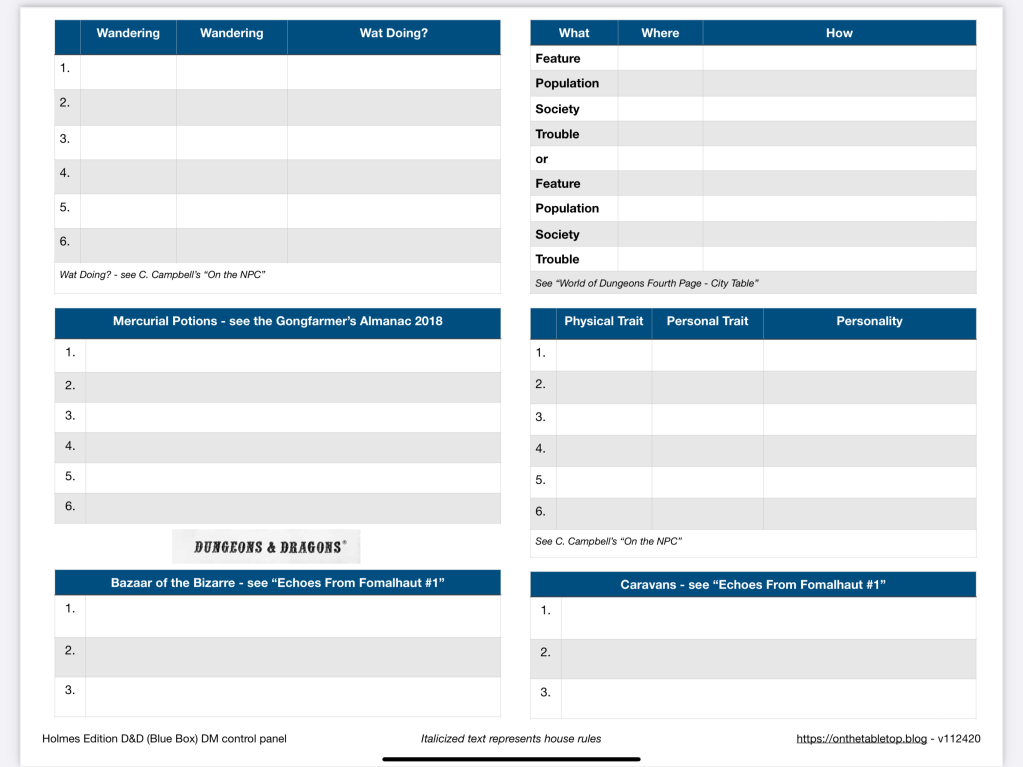 Have updated the DM control panel, finally adding the second page. This includes random tables I find useful: a murcuial potions, wandering monsters, NPC details, town & city variables, bizarre of the bazaar, and caravan details. Each of these has a citation from it’s indie goodness.