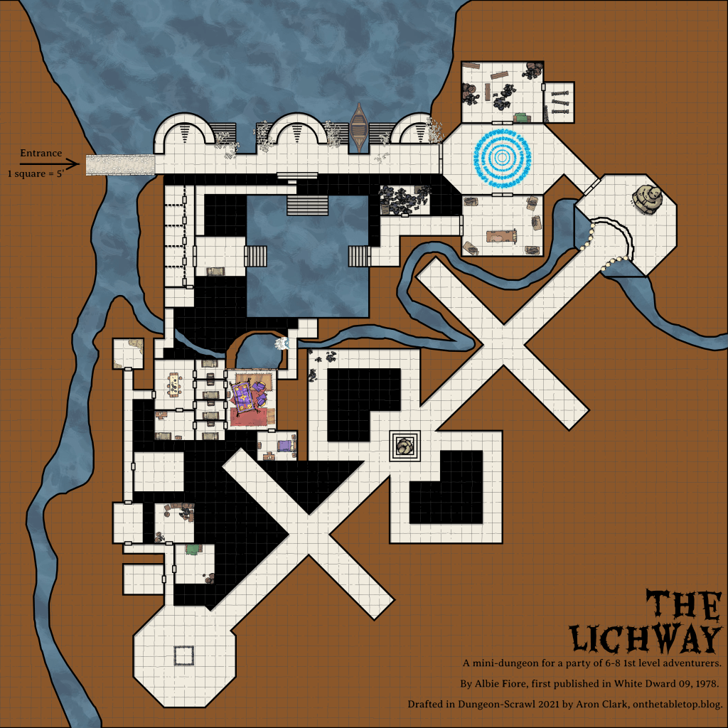 Have just finished laying out Albie Fiore’s “The Lichway” in Dungeon Scrawl. Dungeon Scrawl is an excellent online map making tool. Features include infinite canvas, infinite layers, and tools designed for dungeon mapping. Circles & arches are a bit tough but a creative approach can yield some useful result.