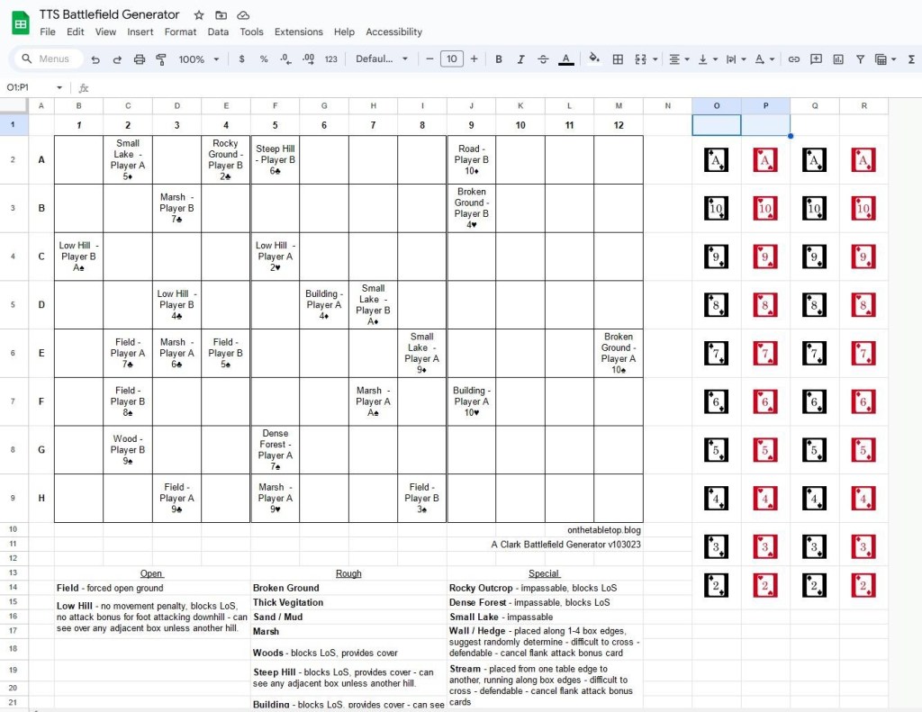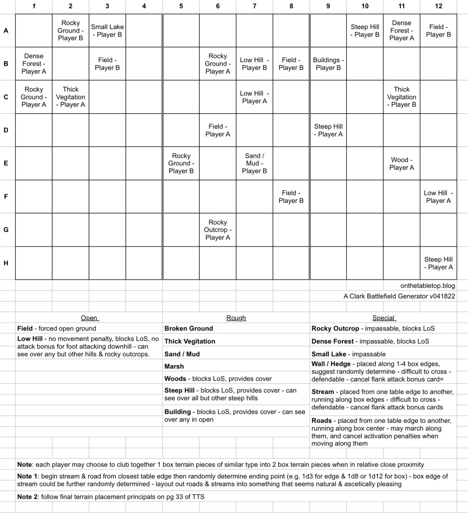 Have just finished another random generator tool, this time for TTS battlefields. That tool available here, sample output follows: